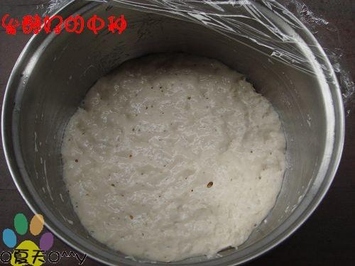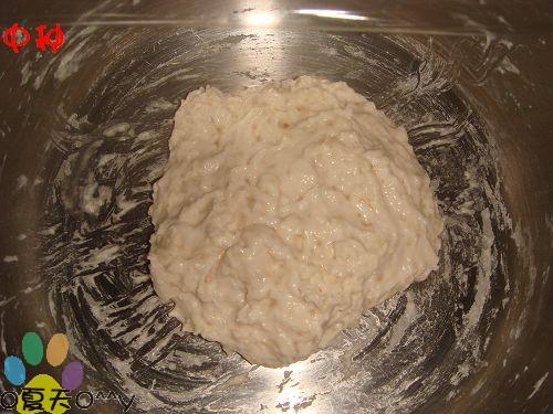 85g高筋粉,5g糖,酵母1/2tsp,水60g,全部混合拌匀,发至3倍大