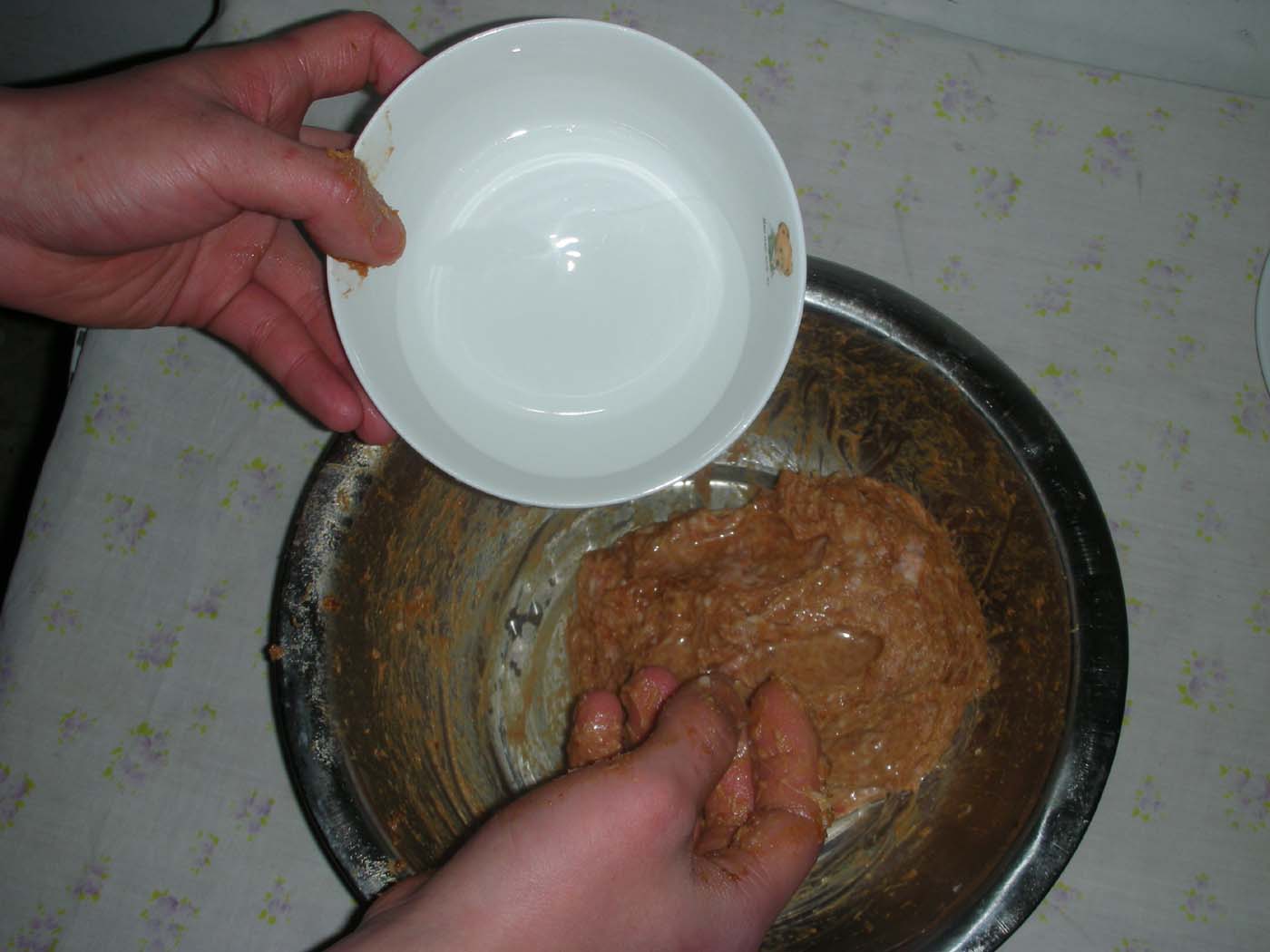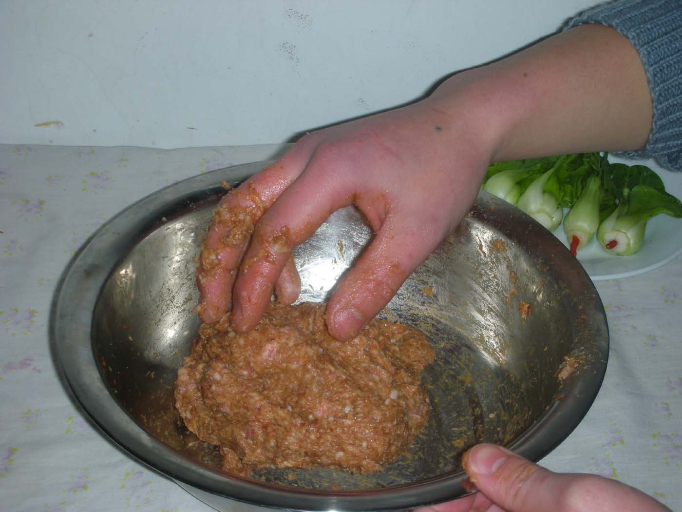 1绞肉500克,鸡蛋1个,酱油10克,盐.糖.鸡精各6克, 葱. 2 绞肉中放入称好的酱油.盐.糖.鸡精, 葱.姜末各少许 .姜末少许,150克水,菜心五颗.荸荠末50克. 生粉20克.