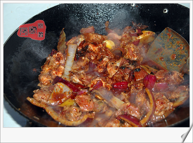 先将豆瓣酱及其它除牛肉外的东西炒香,放牛肉再炒至变色倒料酒喜欢辣的可再加干辣椒