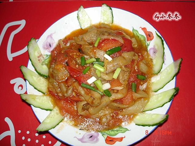 3、加入茄子煸炒,令其出油,茄子快熟时加入番茄后调味; 4、出锅装盘,撒上葱花即可;