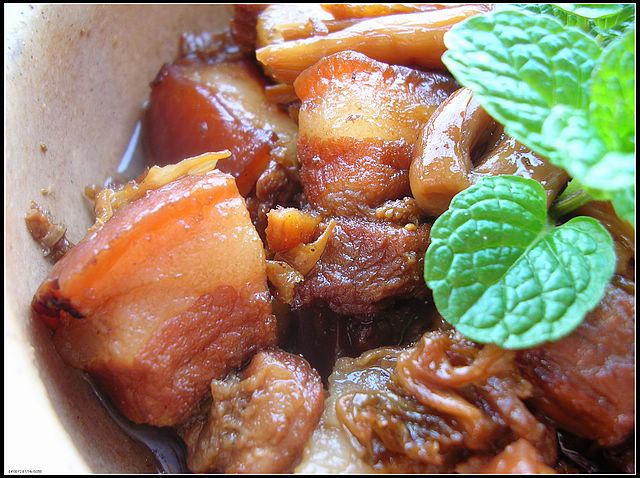 材料:梅菜、五花肉、姜片、蒜头 调味料:生抽、老抽、米酒、片糖