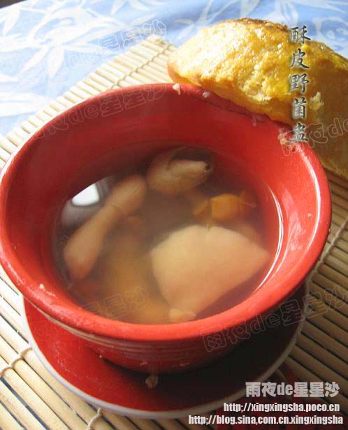 上次没做完的蛋挞的酥皮,还留在冰箱里占了一大块地方,赶紧,赶紧,消灭掉呵呵~~ 不过这次不再做蛋挞了,太甜了,吃多了油沥沥的, 一直想做些中西合壁的菜肴这次等到机会了.做几个用酥皮做的中式菜肴, 先献上第一道汤菜, ' 酥皮野菌盅 ' 酥皮盅在西餐厅常常点, 小盅里装着各式汤,盖上层酥皮,放入烤箱,把酥皮烤的又香又酥.吃时就着汤啃着酥皮别有风味哦.即然春天到了,买了些各式的菌类,烧了锅美味菌汤,扣上酥皮烤的香香的. 实在太完美了