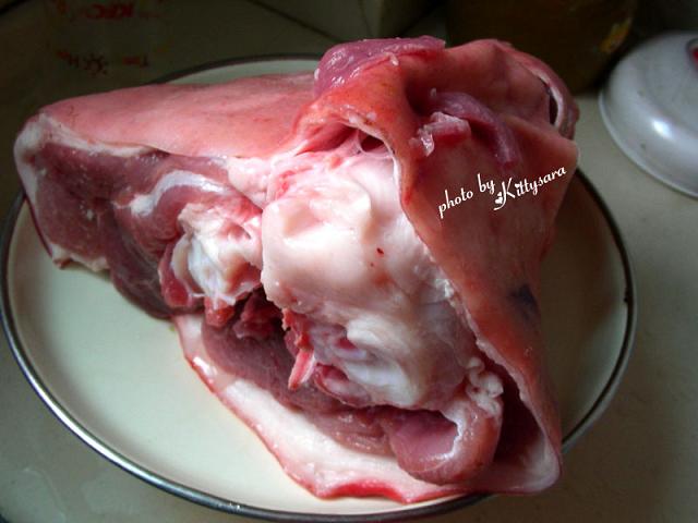 将蹄膀取出,入锅,加入肉汤,八角,桂皮,酱油,(我还放了一些花椒和香叶)糖,烧开后,转中小火煮至皮酥。 拣出葱姜、桂皮、八角原汁用旺火收一下,用水菱粉勾芡,入猪油,浇在蹄膀上,即可食用。 做得时候满屋子的香味,不过做完偶也闻饱了,还算成功~嘻嘻~除了时间上稍微差了点火候,最好再久一些会比较烂~不过没完全按菜谱做,居然说什么冷水要浸4个小时。。。一个菜的跨度居然是两天,吃不消。。。凑活着折腾吧~ 原料:蹄膀,这个有3斤-___-!最后一半给老妈做汤了~