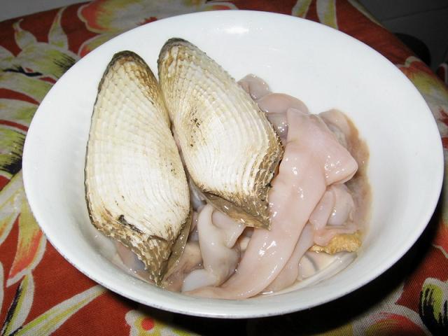 蝴蝶蛤,开水烫,拨出肉,剔掉筋,