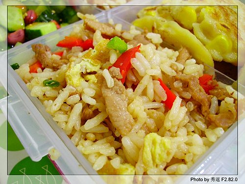 爱心盒饭40:蛋皮肉丝炒饭+玉米饼+拌黄瓜