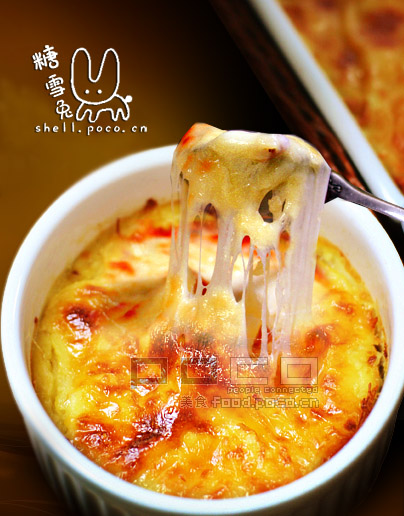 8、鸡蛋打散,放进薯蓉拌匀 9、加适量盐和砂糖调味 10、薯泥倒入烤盘,表面均匀撒上Mozzarella cheese 11、烤箱170摄氏度预热5分钟,薯泥放进烤箱170摄氏度烤约20分钟 12、烤至表面金黄,成功!