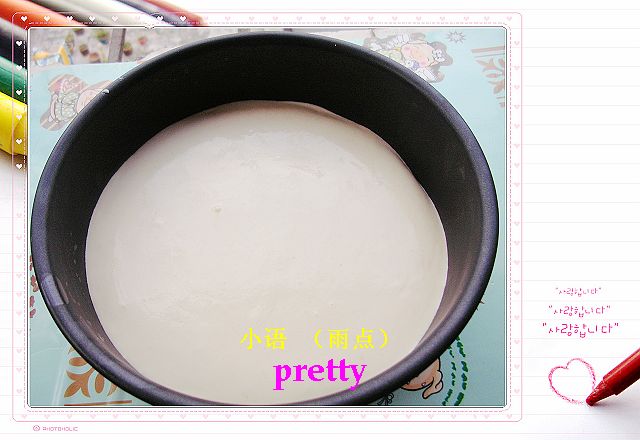 6。将已经混合的芝士馅料加进预先做好的饼底上, 再放上雪柜约六小时。