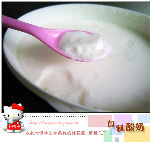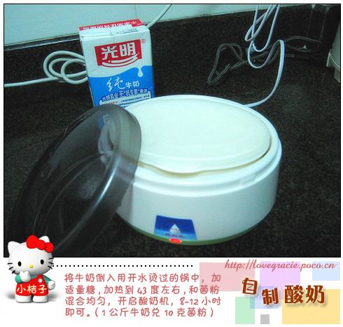 做法:将牛奶倒入用开水烫过的锅中,加适量糖,加热到43度左右,和菌粉混合均匀,开启酸奶机,8-12小时即可。(1公斤牛奶兑10克菌粉)