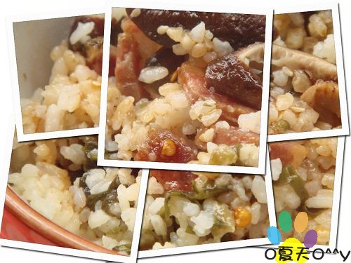 快速做法: 1)香菇,裙带菜泡软,香菇水留用,香菇切丝~香肠切小丁~ 2)米洗干净后加入香菇水(水和饭比例1:1),香肠丁,裙带菜拌匀,加入少少鸡精~ 3)放入电饭煲,按下煮饭,跳到保温时闷10分钟更好~ 4)还加了辣椒圈酱油拌来吃~~