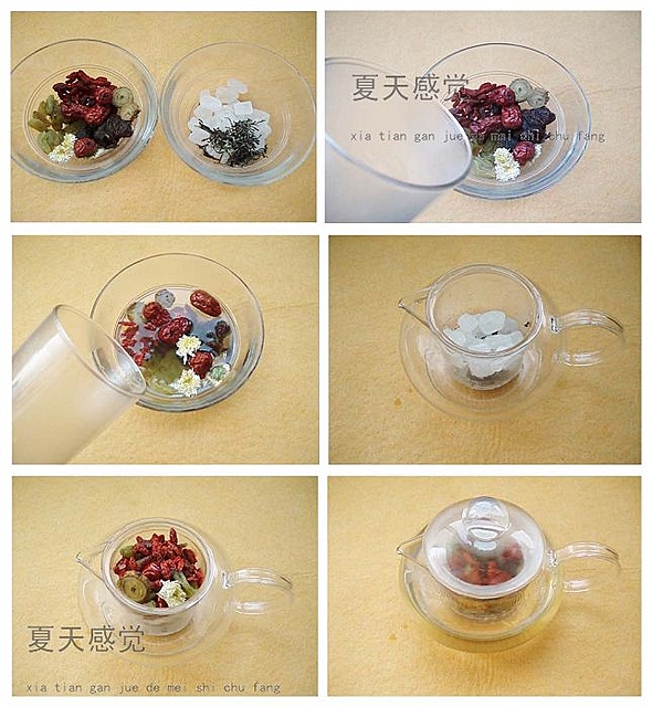 A:红枣 4个 甘草 2片 葡萄干 10克 菊花 3朵 桂圆肉 10克 枸杞 5克 B:绿茶 10克 冰糖 15克(酌情减少) 做法: 将A用温水冲洗一下,再到入温水泡洗1分钟,把B放入茶壶的内壶,再放入A加开水即可