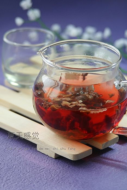 还有一杯花果茶,里边有8种水果干和玫瑰花,喝起来酸酸的,这是买来现成的冲泡一下就行