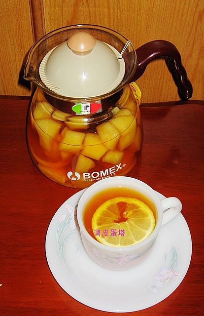 好久没来了,上水果茶一壶!做法:将水果洗干净去皮切块,偶放了苹果、橙和柠檬,还有红茶包2袋,冰糖若干。将切块的水果和茶包&冰糖放入茶壶,倒入开水炮制5分钟即可。