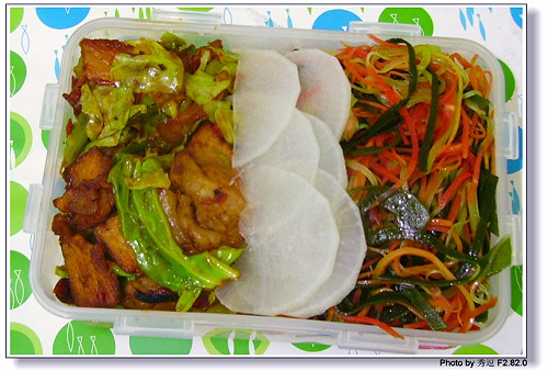 爱心盒饭32:莲白回锅肉+炒三丝(胡萝卜+青笋+海带丝)
