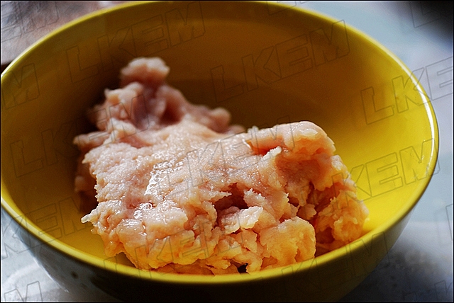 鸡肉打茸,加少许盐、料酒、生粉拌匀