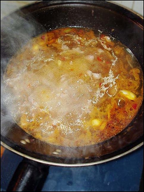 4、炒锅放油,烧热,洒在肉片上;