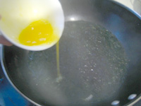 3、将紫菜放入,用筷子拨散,煮30秒,(煮太久会影响口感)此时打散的鸡蛋液缓缓倒入锅内,用勺将在锅内慢慢搅动,使其均匀化开