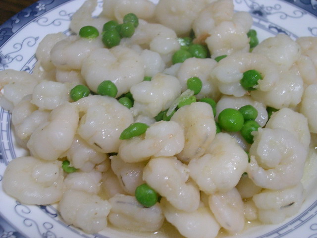 青豆炒虾仁(烧过N多次了),虾仁洗净沥干,青豆先用水煮熟。油锅烧热后倒入虾仁翻炒,加料酒和姜粉,等虾仁差不多熟了加入青豆,再加盐调味,最后淋上香油,炒匀,出锅。(LG粗心,忘挑泥筋了,只能睁一只眼闭一只眼吃了)