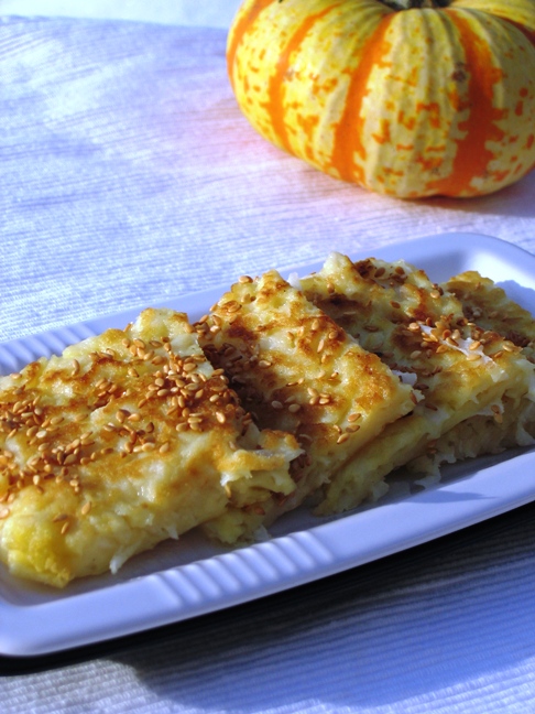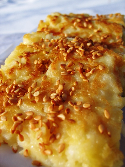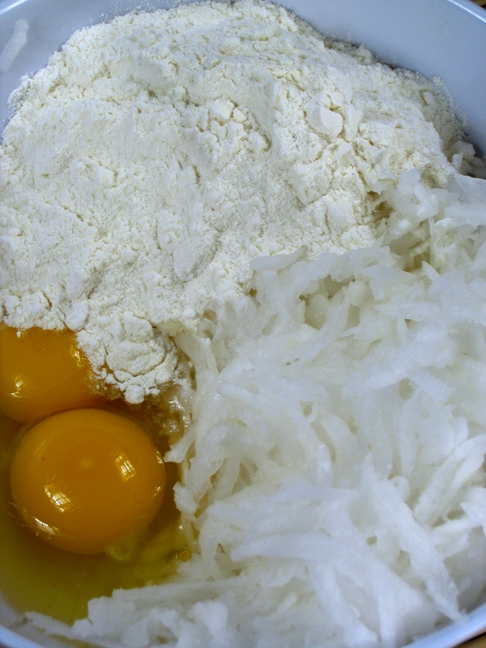 ,放入鸡蛋面粉、盐花椒拌匀,煎至两面金黄即可。