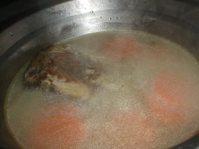 通常都只买魭鱼肚那块肉吃而已,今晚换换新做法,有鱼吃又有汤喝,还有萝卜吃,一举三得! 材料:魭鱼尾、红萝卜、姜 制法:烧热油锅加入姜片将鱼煎六成熟,放水煮开后加入红萝卜块…… 备注:关火后放一点点盐哦!上桌后别忘了将鱼拿出来餸饭哦!