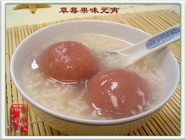 草莓果味元宵元宵节的元宵~~ 用料: 1:酒酿1.5杯,酒酿的做法见红豆酒酿小汤园。 2:糯米粉1杯。 3:糖1