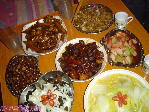 今天已经是初二了,现在才发上年夜饭,虽然有一点点晚,但还是想跟大家分享下~~~年30那天,偶爸妈和公婆一起在偶家吃的年夜饭,感觉很开心和温馨。这应该是结婚后第一次大家又聚在一起吃饭。当然,大厨肯定是偶啦,因为家里材料有限,所以也没有做太多,不过总的来说,还是受到大家的好评的,呵呵。值得一提的