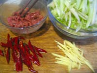 做法:1,牛肉切丝后,放少量酱油,淀粉,料酒腌制十分钟,这时可以准备将芹菜切丝,泡椒及姜切丝