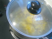 ,把玉米奶油汁倒入煮锅中,倒入鸡汤。