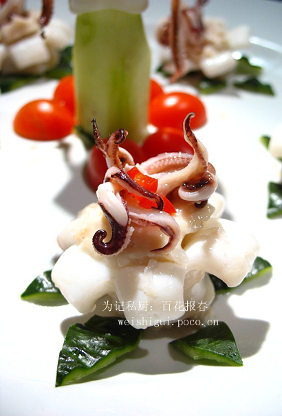 鲜鱿六条洗净,取尾部切开,在开口处竖切大约三公分的口子,和鱼须下锅抄水,卷起捞出。 鸡胸肉100克,虾仁50克,熟肥肉20克。把这三者分别打茸。