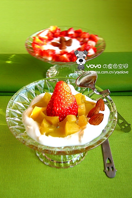 一直都很喜欢酸奶,也喜欢果粒酸奶,以前是买包装好的,自打第一次自己动手作过之后就没怎么再往回买过,在家里做的最大好处就是料足、其它如:没加防腐剂、食用香精、增稠剂啥的就更不用讲咯,饭后一人来上一杯酸酸甜甜又利于消化。将来有了小孩子,一定让他养成不在外边乱吃零时的习惯,不是不给他零用钱,而是让他坚信妈妈做的才是最最健康的美味!豁豁,这么一想就觉得特脸红~做法:把水果切成块,很原