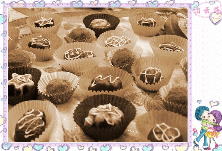 有情人送情人,没情人送自己…… 材料:黑巧克力、白巧克力、牛奶巧克力鲜奶油黄油酒 做法: 1、60ml鲜奶油+20g黄油煮至沸腾后关火加入切碎的黑巧克力搅拌均匀,待凉后加入红酒。 2、准备两个小碗(不锈钢的比较容易导热)两个大碗,两个小碗里面分别放入切碎的白巧克力和牛奶巧克力,先放入微波炉叮30秒,两个大碗倒入适量开水,两个小碗放在大碗里面,使巧克力融解。 3、现在模具里面刷上一层牛奶巧克力,然后再刷一层白巧克力,再倒入黑巧克力酱,最后用牛奶巧克力封底。放