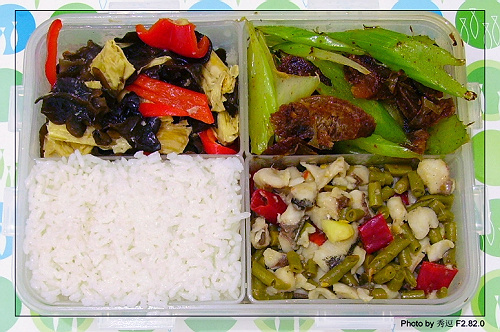 爱心盒饭24:泡豇豆鱼丁+西芹炒腊肠+木耳甜椒腐竹
