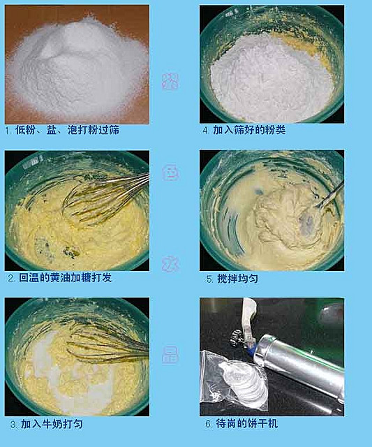 盐一小撮 泡打粉1小勺(可以不加) 方法: 1. 黄油室温软化,加糖打发,呈羽毛状 2. 加蛋黄(一个一个的加,加一个打均匀再加另一个) 3. 加牛奶,打均匀 4. 盐+泡打粉+低筋面粉,拌匀,筛入打发的黄油中,拌匀 然后就是我的饼干机出场啦。 把面团装进去,选择喜欢的花片,烤盘刷油,就压出漂亮滴小饼干咯~ 烤箱180度预热,烤15分钟。