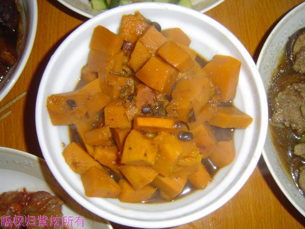 刚刚吃完了晚饭,就把家宴的PP发上来,还热呼着呢~~~如图:1红烧肉,2 冬笋黄瓜鸡丁,3香菇酿肉,4 南乳排骨, 5 蒜茸芥兰, 6 豆豉南瓜最喜欢南乳排骨,味道浓郁,就是不知道为什么颜色没是特红~~遗憾的是冰糖没有了,所以红烧肉颜色不是