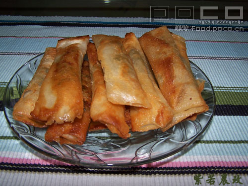 荠菜春卷,简直最爱以前一直都是妈妈做,小陈吃今天,小陈亲手下厨,美死LG了火候掌握的不是很好,凑合着吃吧!