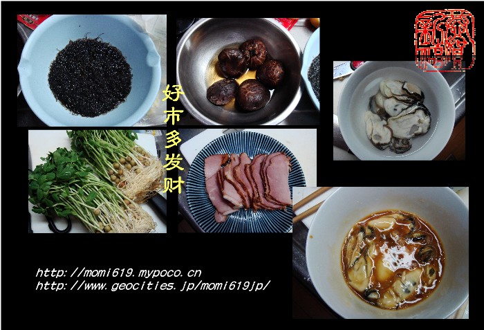 做法:1.发菜和干香菇分别浸水泡发。生蚝洗净泥沙。2.在开水锅内加少许油,和盐,下豆苗烫熟后,滤干水分待用。3.生蚝在开水锅内烫熟后,捞出,用厨房用纸吸干水分,加入酱油,淀粉,鸡蛋液拌匀,稍腌。4.开水锅内加蒜片,生姜片,葱段和蚝油,然后下发菜烫熟,滤干水分后,和豆苗一起围在盘子周边。5.起油锅,将生蚝放进去用中火两面煎上色,同时将叉烧肉和香菇也放入煎熟上色。然后整齐的码放在盘子中间。6.另起油锅,烹绍酒,出香味,加高汤,盐,稍许砂糖,蚝油,胡椒粉烧滚后,用水淀粉勾芡后,浇在盘子里的材料上即可。页码:[1] [2] [3] [4] 第1页、共4页