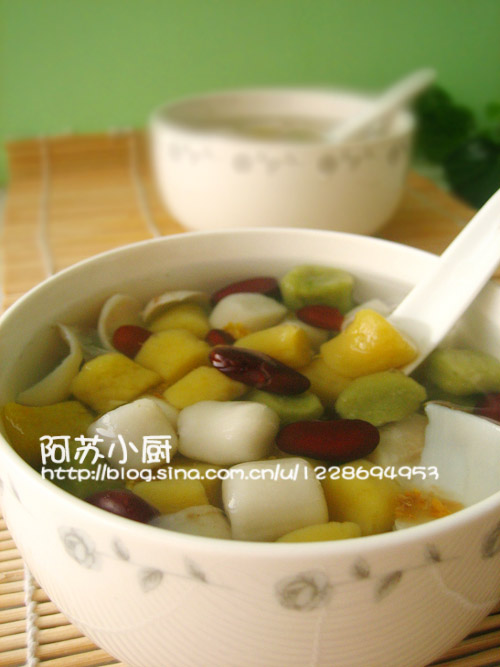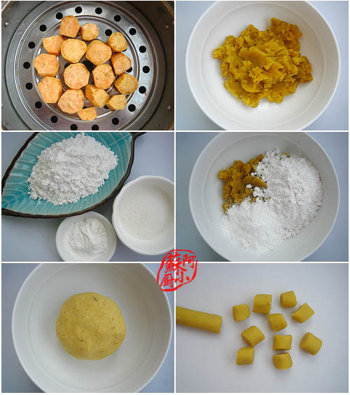 ![]() 材料:红薯:150克,芋頭300克、地瓜粉60克、太白粉60克,抹茶粉5克,砂糖,桂花酱。红薯圆的制作: 红薯去皮洗淨切小块,移入蒸鍋蒸10-15分钟,軟後取出,用勺子捣成泥,加入地瓜粉20克,太白粉20克,细砂糖10克,拌匀,揉成面团,搓成手指粗细的长条,切小段。 [1] [2] [3] [4] 第1页、共4页
