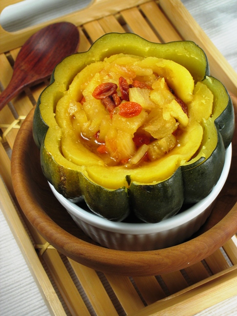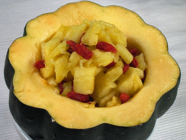 半个南瓜里里面放菠萝、枸杞子、红糖蒸30分钟即可。