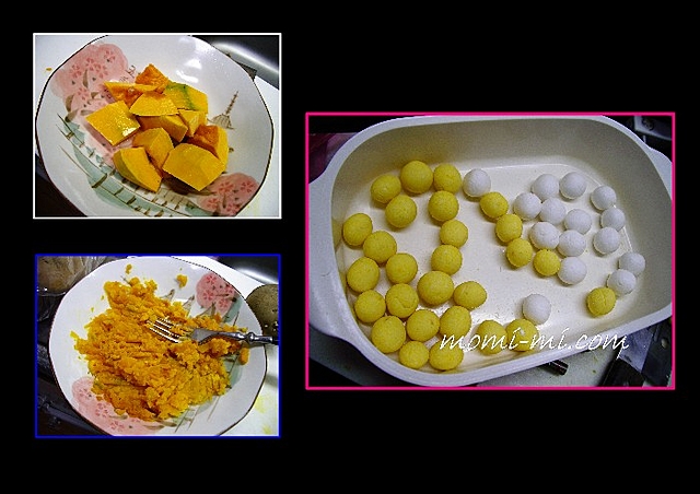 南瓜小丸子,再用糯米粉加水搓成普通糯米小丸子。