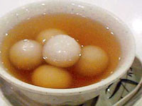 压紧.最后是把煮好的汤圆(用手指轻按表面凹下去就是熟的,马上舀起,二个一起放在黄豆粉里,然后用两只手抓住瓷盆边上下左右摇晃,等汤圆”变身”--由白白胖胖便成金黄煌煌.然后五个一碗放在洁白的瓷碗里,再浇上糖浆,这时就可以享用了.