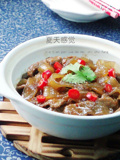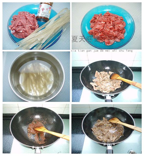 3 锅留底油烧四成热,放入沙茶酱炒开,加入粉条牛肉,少许盐,糖 ,水,烧开入味即可[1] [2] [3] [4] [5] 第4页、共5页