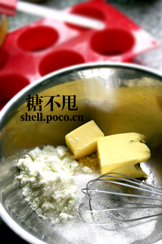 材料: a 奶油 80g(室温软化) b 糖 100g c 盐 2.5 d 脫脂奶粉 14g e 蛋 60g(约一个,打散) f 水 150g g 低筋麵粉 200g h baking powder 10g i 伯爵茶包 2包 4g(剪开茶包倒出茶叶末)
