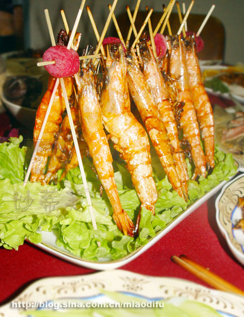 主料:大虾 配料:盐、生菜、竹签、红萝卜(青萝卜、胡萝卜等都可以) 做法: 1、虾洗净,去虾肠、虾须,用盐略腌 2、把虾用竹签串起来,锅内放油,烧至七成热,放入虾炸熟,摆入用竹签,萝卜生菜装饰好的盘内即可