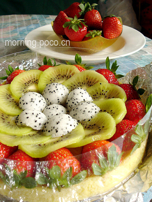 饰面:首先用柚子蜜抹面,然后再配以草莓、奇异果、火龙果以装饰,成为花开富贵、百花齐放的草莓芝士蛋糕^_^