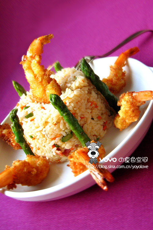 也奇怪了,刚刚开始学习做饭的时候疯狂买了好多食谱的书,可几乎从来没认认真真的按着那上面的步骤做过,可不是俺不虚心哈,绝对的!而是所有的菜谱印刷的都非常漂亮,一道道菜一份份点心人家那摄影摄像的技术真是绝门了,可厨房吧,一但工作起来那是蒜皮飞扬油星乱溅的地儿,俺打小就特爱惜书籍,一寻思着这边切好了菜那边洗好了鱼,手上还带着水珠一翻那杂志,哎,糟践人家摄影作品哈~ 哪个出版商要是聪明,能出版一种塑料卡式的菜谱准好卖!你是放案板放灶台、躺着放立着放、粘了水澎上油都不要紧,忙活完一擦又特干净的汇成一本,象俺们这样又假装干净又想着进步的,肯定买会再买上几本继续学习哈~ 这个炒饭是俺破天荒按着《世界级泰国茉莉香