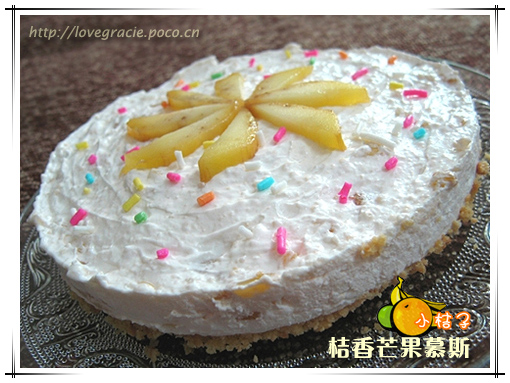 在慕斯里加了芒果丁和安德鲁森的桔味果酱,在表面装饰芒果、彩色朱古力针和银珠糖,其实后两者完全没必要,在冰箱冻了一晚后,它们基本已经软化,毫无口感。 这次饼干碎做的底倒是蛮结实,有点饼样。 用剩余的材料还做了慕斯杯。