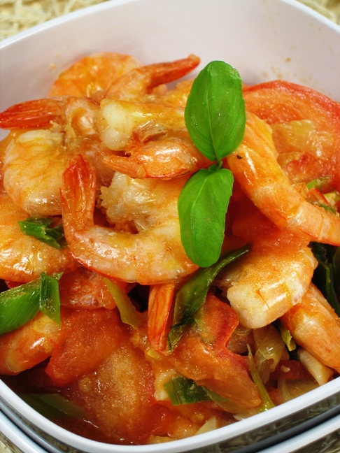 2. 放入西红柿炒3分钟,放入大虾,盐糖柠檬汁即可。