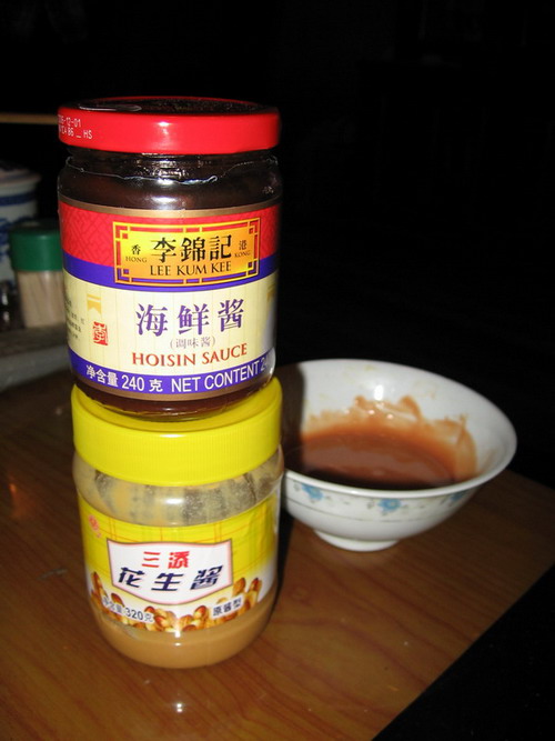 用3勺水化开1勺花生酱,再加2勺海鲜酱拌匀待用。