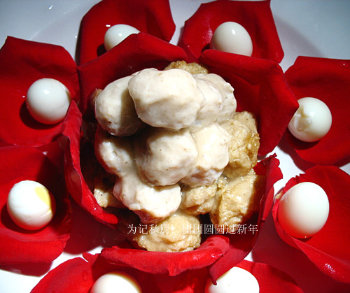 上回作的猪元宝就是想要这样的摆盘。 新年到了,正是合家团圆时,一家人围在桌边欢声笑语。家,让人温暖的地方。 快过年了,时逢洋节,花卖得贼贵,肉赤!^_^