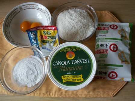 1. 材料:糖粉40克;奶粉10克;椰蓉100克;黄油50克;蛋黄2个;牛奶1汤匙