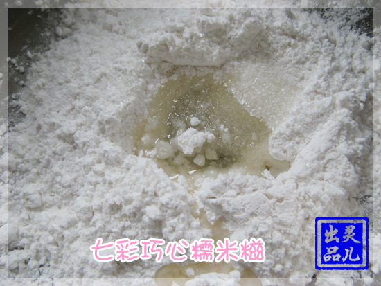 步骤一: 将糯米粉倒入盆内,中间留空,加入食油,白糖,滴入色素水,混合均匀。